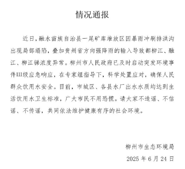 6月24日,廣西柳州市生態(tài)環(huán)境局發(fā)布通報:近日,融水苗族自治縣一尾礦庫堆放區(qū)因暴雨沖刷排洪溝出現(xiàn)局部塌陷,疊加貴州省方向強(qiáng)降雨的輸入導(dǎo)致都柳江、融江、柳江銻濃度異常。柳州市人民政府已及時啟動突發(fā)環(huán)境事件Ⅲ級應(yīng)急響應(yīng),在專家組指導(dǎo)下,科學(xué)處置應(yīng)對,確保人民群眾飲用水安全。目前,市城區(qū)、各縣水廠出水水質(zhì)均達(dá)到生活飲用水衛(wèi)生標(biāo)準(zhǔn),廣大市民不用恐慌。請大家不造謠、不信謠、不傳謠,共同依法維護(hù)健康有序的社會環(huán)境。