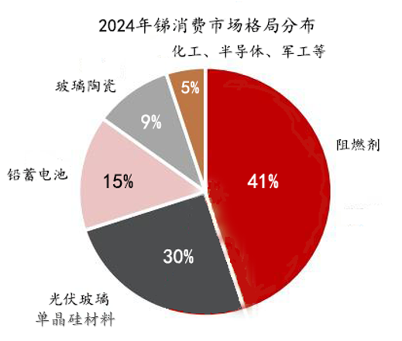 ?產(chǎn)量受限:2024年中國金屬銻產(chǎn)量7.2萬噸,同比-10.3%,產(chǎn)能利用率33%,受制于原料供應(yīng)不足。2024年需求量為9.71萬噸。主要是光伏系統(tǒng)及阻燃材料的發(fā)展,對金屬銻的需求擴大。 ??